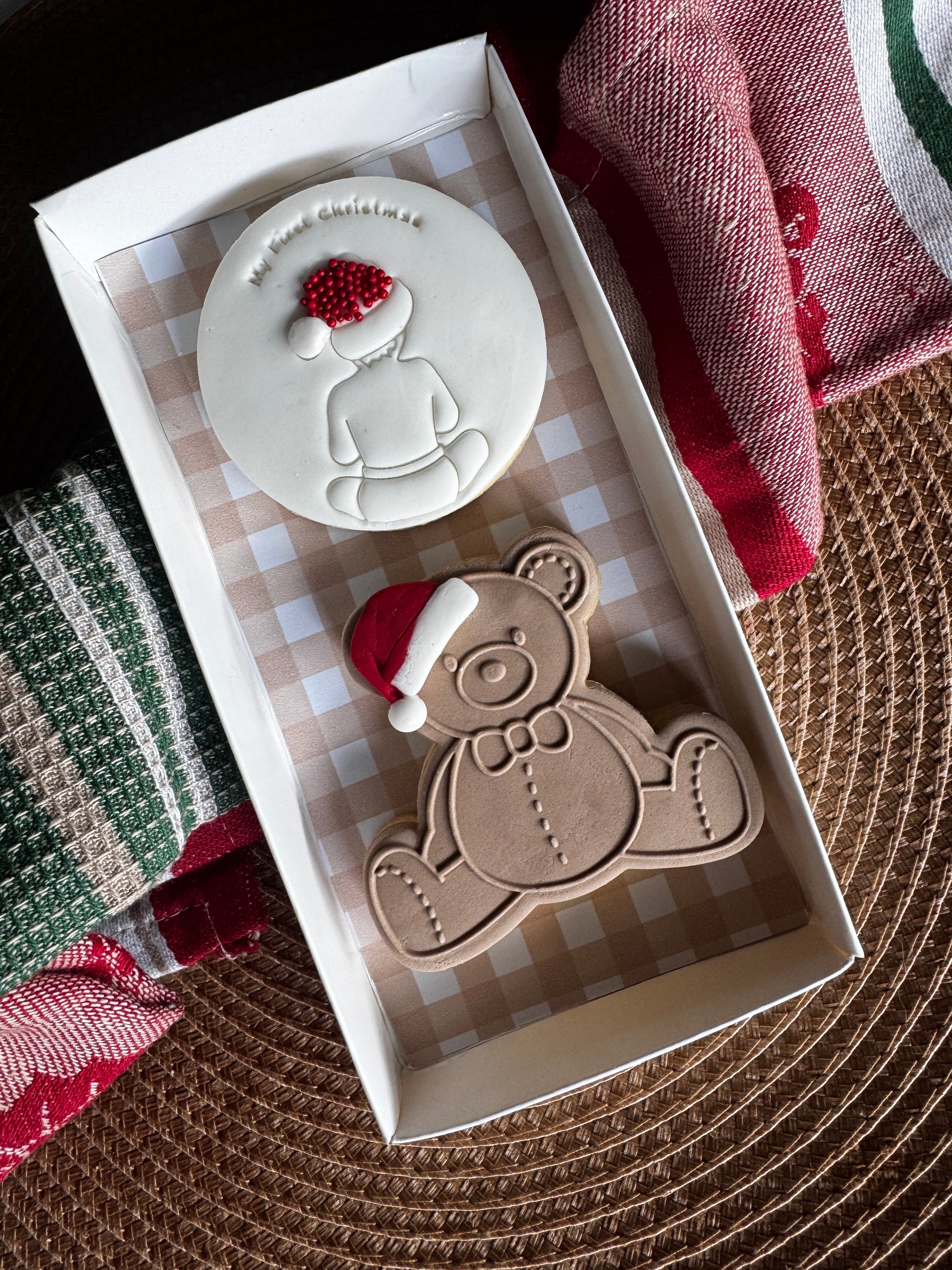- 🎀 Two premium hand-decorated cookies – one featuring “Baby’s First Christmas” and the other sweet teddy bear🧸 ).